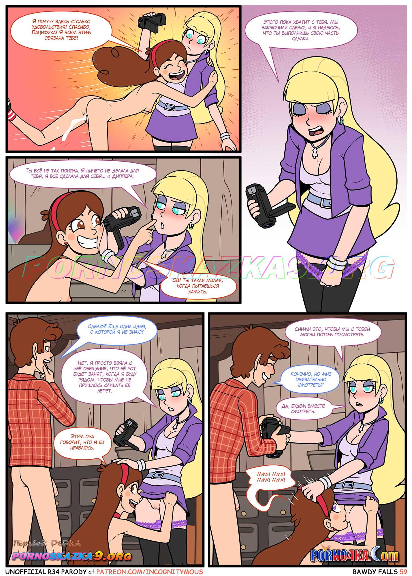 Пацифика черт знает сколько времени дожидалась у хижины за углом, когда Мейбл уйдет и Диппер останется один. Наконец, она дождалась и после этого немедленно вбежала в хижину и прямо заставила ошалевшего Диппера удовлетворять ее. Но вскоре они оба ошалеют, когда их застукает с поличным внезапно вернувшаяся Мейбл. Она сняла развратников на телефон и потребовала выкуп…
